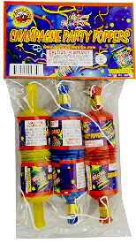 Party Poppers in a six pack bag, shoots multi-colored streamers.