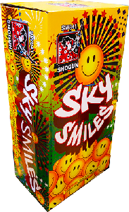 Sky Smiles Item#:RL142Packed:12 Bxs.Size:12"x6"x4"Don't it make you want to smile! 6 shots of 3 different color shells that break into a big smiley face, all new!