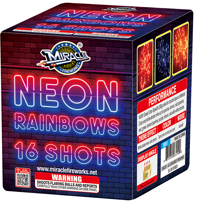 Fantastic cake with six different vivid and neon colors, red/green/yellow/blue, and purple and cyan. 4 shot finale