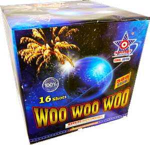 Woo Woo Woo Item#:MT243Packed:4 per caseSize:9.5"x9.5"x9"12 Shots of crackling tail to red palm with white glitter, crackling tail to green palm with white glitter, crackling tail to purple palm with white glitter.