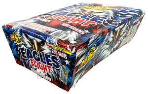 Bursting with red, white, and blue mines, alternating with rows of three quickeded shots of blue tails to red and blue stars with silver glitter. Ends with a five-shot finale of blue tails to red and blue stars with silver glitter.34 Shots.