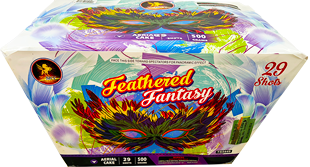 Feathered Fantasy Item#:MT269Packed:4 per caseSize:14.8"x9"x8.9"Shooting in straight up, V,W, and fan shape, all with giant golden palm tail up, breaking gorgeous gold&silver willow with blingfing neon dahlia and red plum!