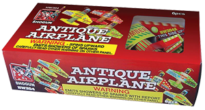 Spins with a loud whistle on the ground then flies upward with green flame and crackling stars.