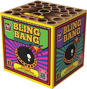 Performance:Color meets shimmer in Bling Bang! Red, blue, and white strobes burst into the sky, followed by vivid purple, gold willows, and red plum. A compact display with bold impact.